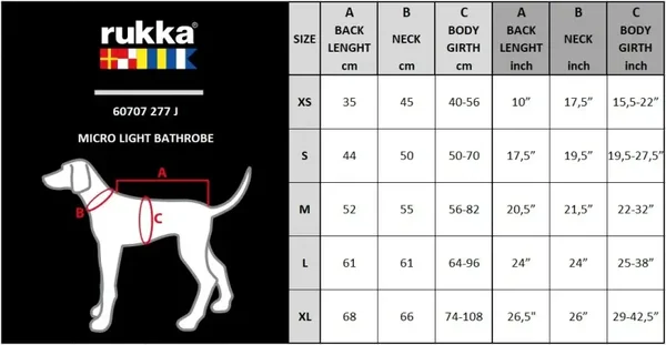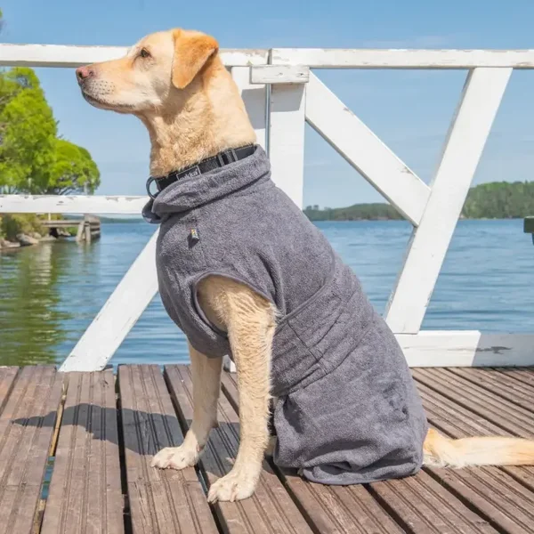 Wist je dat: op warme zomerdagen kan de badjas ook dienen als verkoelende jas voor de hond. Spoel de badjas uit in koud water, wring uit en trek aan bij je hond. Herhaal dit zodra de badjas opdroogt.