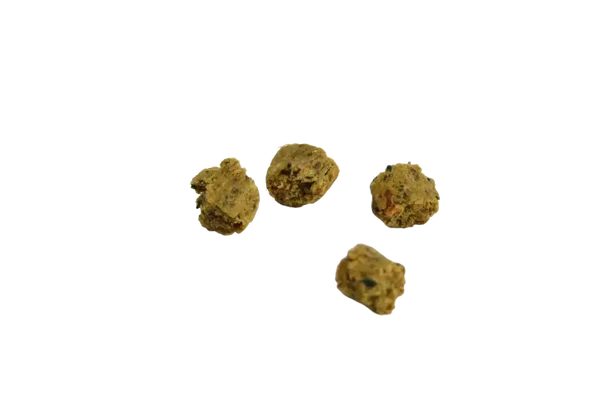Samenstelling: Verse kip (45%), aardappelvlokken, lupinemeel, verse zalm (5%), eipoeder (5%), magere melkpoeder (2,5%), biergist (2%), gemalen lijnzaad (1,7%), dicalciumfosfaat, gedroogde abrikozen (1,5%), gedroogde appel (1,5%), pompoenpittenmeel, verse kippenlever (1%), Provençaalse kruiden, fijne groentenbouillon, bruine alg, inuline (0,5%), zonnenbloempitten (0,5%), gedroogde rozenbottels (0,4%), kurkuma, oreganoextract, zwarte komijn (0,3%), gemalen groenlipmossel (0,1%), eischaalpoeder. Nutritionele toevoegingen: Vit A: 8000 IE, Vit D3: 1000 IE, Koper: 7mg., Zink 80mg., Vit E: 150 IE. Met natuurlijke antioxidanten: oregano extract.